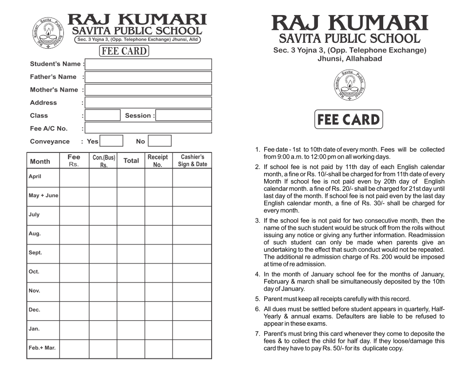 A card to keep record of fee of a student/candidate.